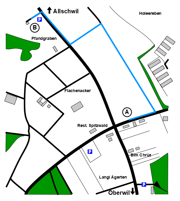 A Bushaltestelle „Spitzwald“. Von da an folge der eingezeichneten blauen Linie zu Fuss bis zum jeweiligen Übungsplatz.